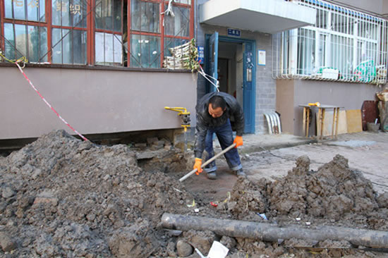 隨即記者來到徐先生家所住的新村5-5二單元,維修人員正在所刨的坑內(nèi)換新的排水管,府民物業(yè)維修隊(duì)隊(duì)長(zhǎng)張合平告訴記者:“由于排水管埋在地下兩米處左右,排查起來比較麻煩,這正是基礎(chǔ)墻中間的鑄鐵排水管斷裂,所以要把屋里屋外地下排水管都打通才能進(jìn)行維修。”據(jù)了解,從29日開始,維修人員就對(duì)新村 5-5二單元的下水道進(jìn)行排查。
