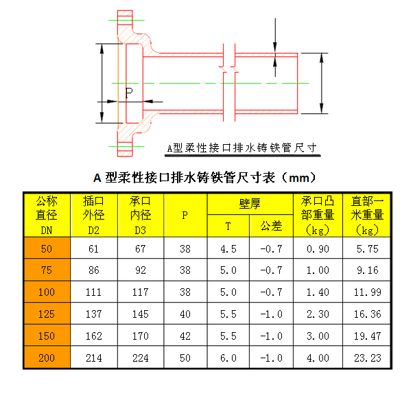 本工程排水系統(tǒng)的污廢水管道采用A型柔性接口鑄鐵排水管,承插式柔性接口法蘭連接。鑄鐵管的規(guī)格尺寸根據(jù)下圖及下表確定。